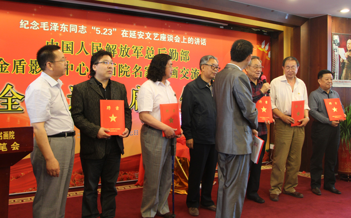 在今天的会议上,解放军总后勤部金盾影视中心领导为书画院院长、副院长、高级顾问等颁发了聘任证书,为军地书画名家颁发了拥军爱民书画家荣誉证书。